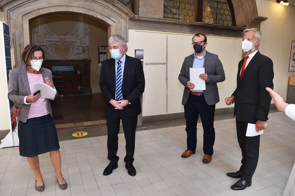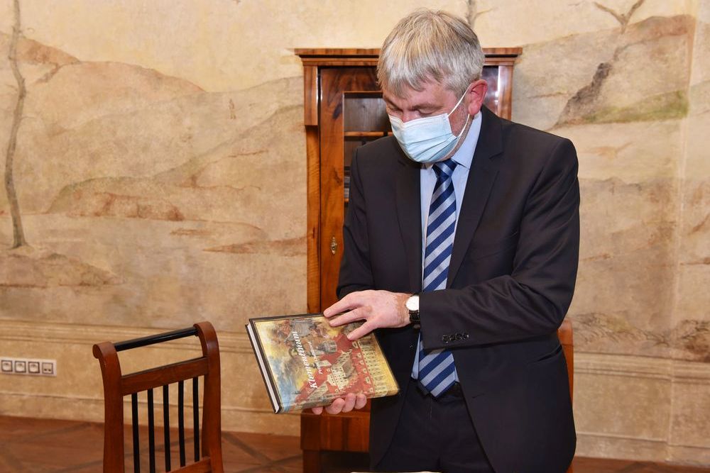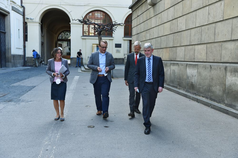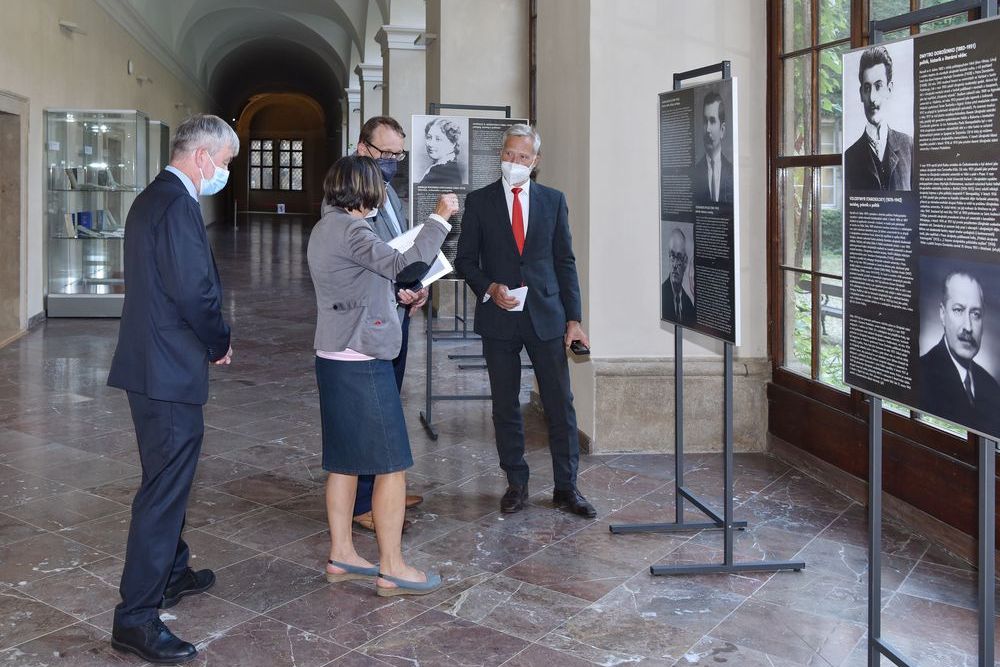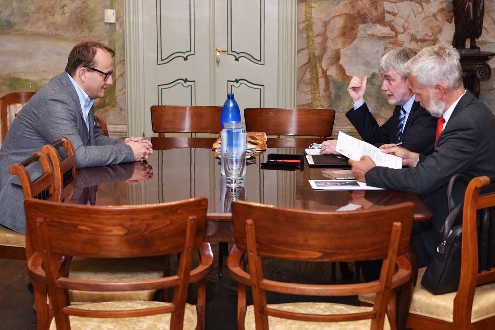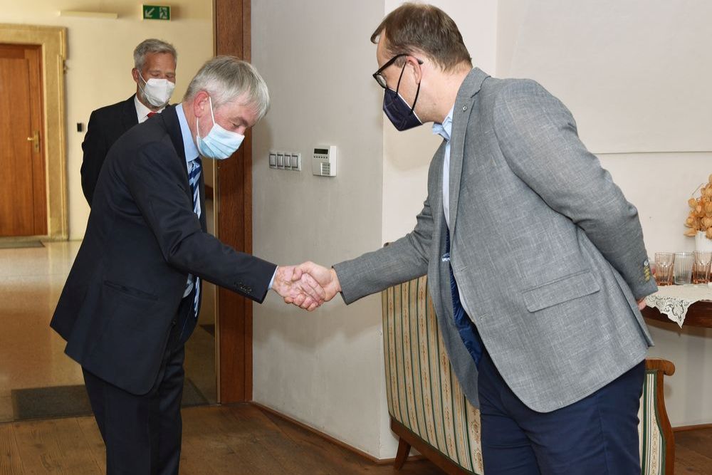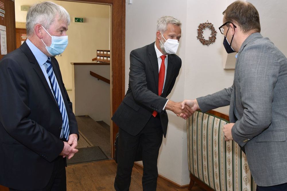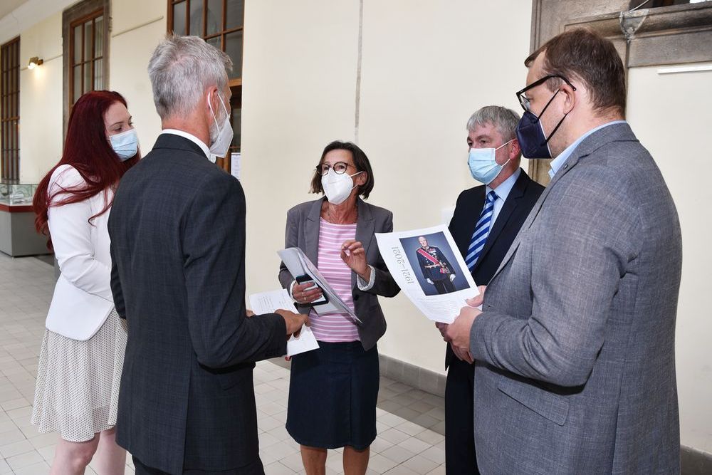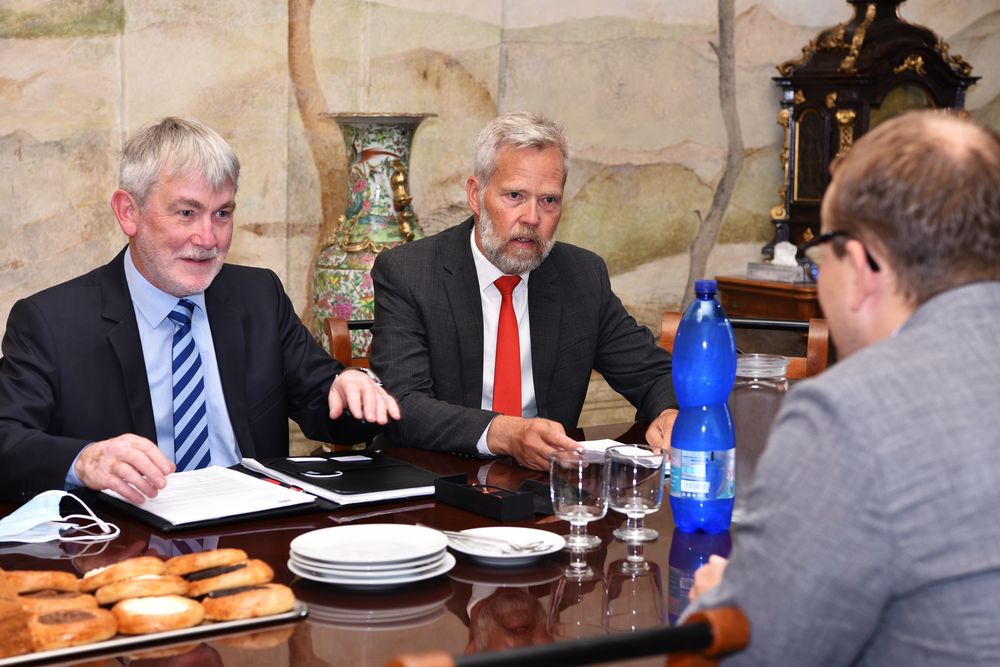 Dne 3. září 2021 v odpoledních hodinách navštívil Národní knihovnu ČR velvyslanec Norského království v České republice pan Robert Kvile v doprovodu svého spolupracovníka Terje Bjorna Englunda. Oba pány přivítal generální ředitel NK ČR Tomáš Foltýn. Hlavním bodem programu bylo jednání o organizaci výstavy ke stoletému výročí vzájemných diplomatických vztahů, která se uskuteční v Klementinu na podzim tohoto roku. Foto: E. Hodíková, NK ČR.