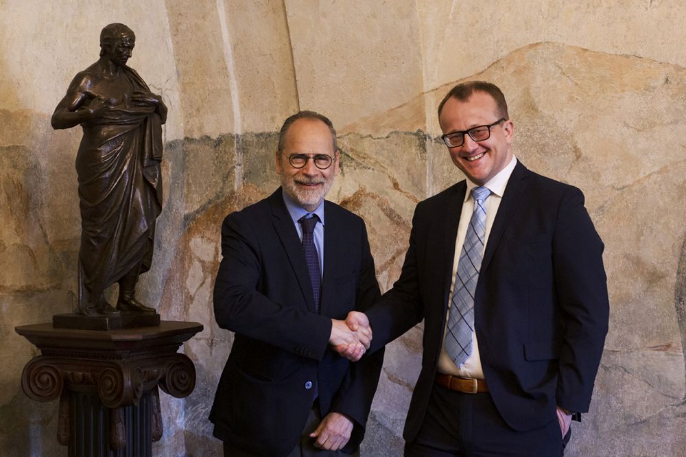 Národní knihovnu České republiky 4. května 2023 navštívil velvyslanec Španělska v ČR J. E. Alberto Moreno Humet v doprovodu ředitele Instituto Cervantes v Praze Gonzala Manglano de Garay a zástupců kulturního oddělení IC Jesuse Clavero Rodríguez a Petry Skládalové. S generálním ředitelem NK ČR Tomášem Foltýnem prodiskutovali možnosti spolupráce. Foto: M. Košanová, M. Tichá (NK ČR)