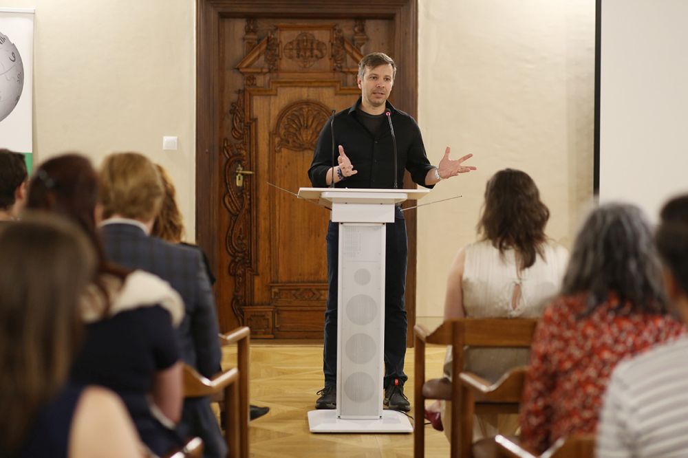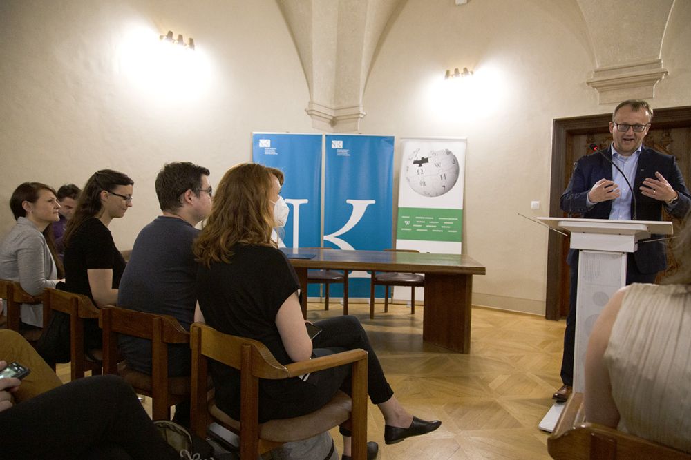 Národní knihovna a Wikimedia ČR podepsali memorandum o spolupráci na tvorbě Wikipedie, zpřístupňování databází NK přes Wikidata aj. K podpisu došlo 9. června 2023 v pražském Klementinu, spolu s prvním oficiálním setkáním zástupců Wikimedia Europe – mezinárodního sdružení 26 poboček Wikimedie. Akce se zúčastnil náměstek ministra pro legislativu odpovědný za digitalizaci Ondřej Profant, poslanec Evropského parlamentu Marcel Kolaja a další hosté. Foto: M. Tichá, NK ČR.