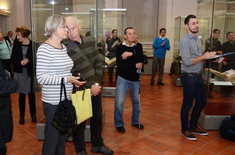 Fotogalerie z vernisáže výstava, která představuje vybrané hudební rukopisy, kancionály a graduály z fondů v Národní knihovny České republiky. Tyto rukopisy sloužily v 16. století pro zpěv na kůrech městských kostelů a objednávali je movití a vzdělaní měšťané, řemeslnické cechy i představitelé vyšší a nižší šlechty. Cílem výstavy je na uvedených příkladech ukázat jednotlivé iluminace chorálních rukopisů z hlediska nepřeberného množství ikonografických motivů, které samy o sobě představují vzorník biblické ikonografie. Galerie Klementinum - Výstavní sál: 19. 11. 2015 - 3. 1. 2016. Foto: Eva Hodíková, NK ČR.