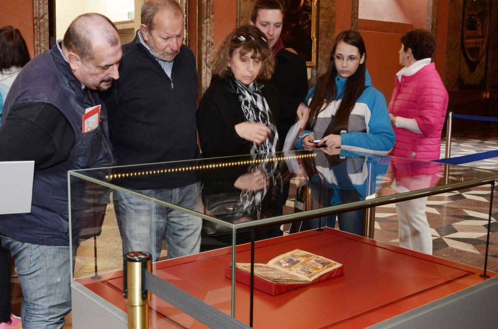 Fotogalerie z mimořádného vystavení latinského zlomku bohatě iluminovaného rukopisu při příležitosti zahájení světové výstavy EXPO 2015 v Miláně. Jednodenní výstava se konala 1. května 2015 v Zrcadlové kapli Klementina. Foto: Eva Hodíková, NK ČR.