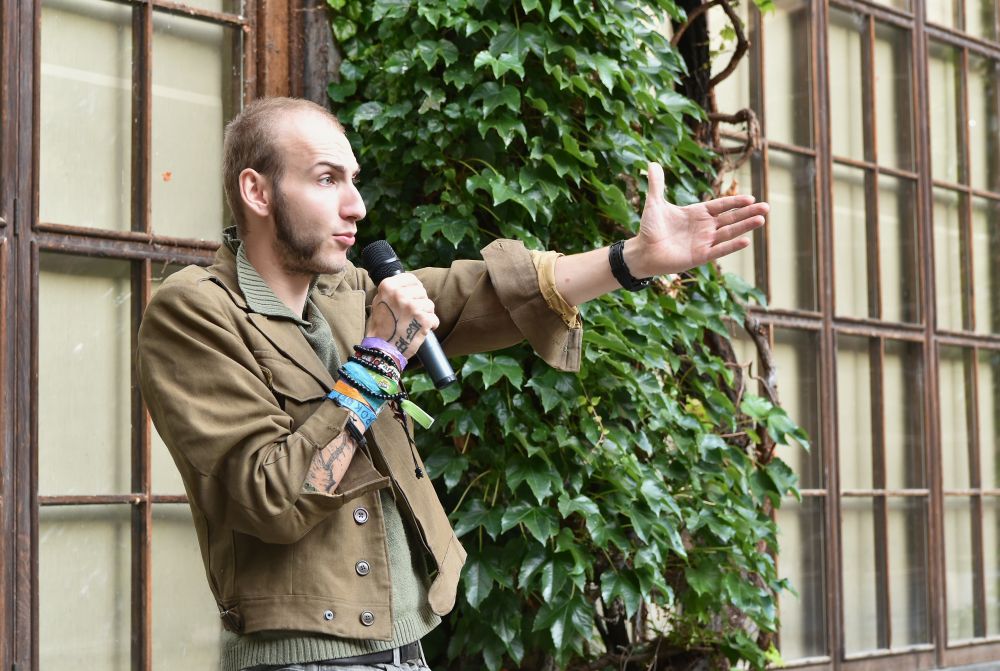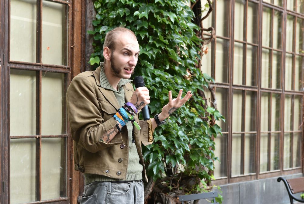Hodinový zápas muže s mikrofonem. Křížení slam poetry, stand-upu, monodramatu a školení o bezpečnosti práce - to vše zahrnovalo představení, které se v rámci cyklu Klementinum 190 konalo 6. září 2017 na Révovém nádvoří. Foto: M. Kárná, NK ČR.