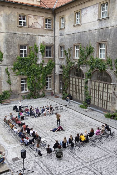 Všechno je to o… (It´s All About…) lidské blízkosti. V interaktivním představení rakouské choreografky Helene Weinzierl, kde nechybí nadsázka, nejsou protagonisty jen tři mužští performeři, ale i vy sami. Nejprve ve vlastním světě, posléze ve vztahu s druhými, společně vytvářejíce novou realitu. Na první pohled zábavná setkání však v sobě skrývají i absurditu současné společnosti. O čem je život? O všem a o ničem. Taneční představení se konalo na Révovém nádvoří Klementina ve dnech 23. - 24. 6. 2023. Foto: M. Tichá, NK ČR.