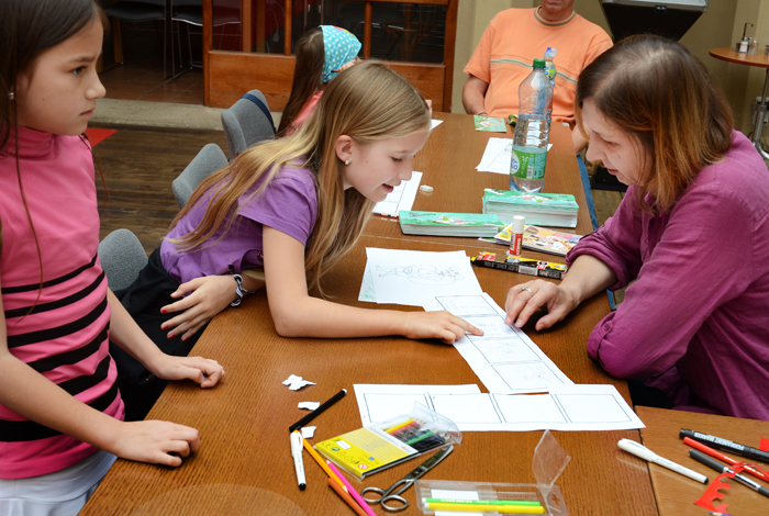 Akce "Vítání prázdnin" se konala 27. 6. 2013 v Nosticově paláci. Tvořivé dílny dětem nabídly možnost nakreslit si vlastní komiks, malovat podle četby, malovat knižní obaly nebo ručně výrobit vlastní knihu. Součástí programu byla přednáška „Známá neznámá pravidla Facebooku". Foto: Milena Kárná, NK ČR.
