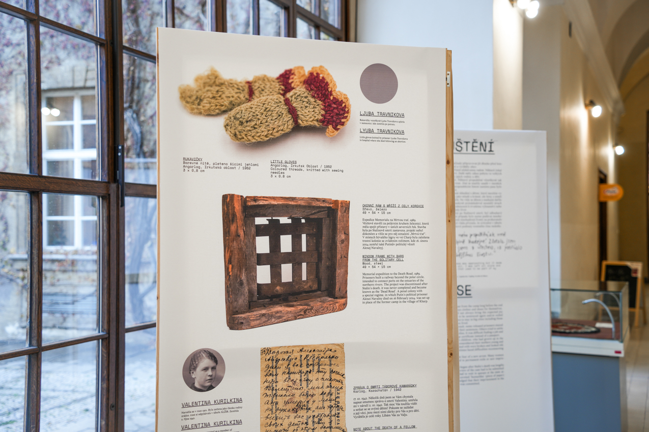 Fotogalerie z výstavy, která netradičním způsobem přibližuje každodenní život v sovětských lágrech od zatčení až po návrat na svobodu. Hlavními prostředky, skrze něž se návštěvník dozví detaily jednotlivých příběhů, jsou fotografie unikátních předmětů a dalších exponátů, které si s sebou ženy přivezly z táborů Gulagu. Plesové šaty, ve kterých byla jedna z žen zatčena a strávila v nich mnoho let v pracovních táborech, výšivky, kresby, dětské panenky, nitě uzpůsobené k porcování chleba – to vše je hlavním motivem 24 panelů, z nichž s výstava skládá. Výstavu za spolupráce Slovanské knihovny připravily organizace Memorial a Gulag.cz. Na rok 2025 se plánují její další zastavení po celé České republice. Veřejná vernisáž se konala 27. listopadu 2024. Foto: Z. Homolka Fedorová, NK ČR.