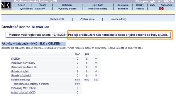 - V části Čtenář přímo pod svým jménem naleznete informaci, do jakého dne platí Vaše registrace v NK ČR, a jakým způsobem si ji můžete prodloužit.